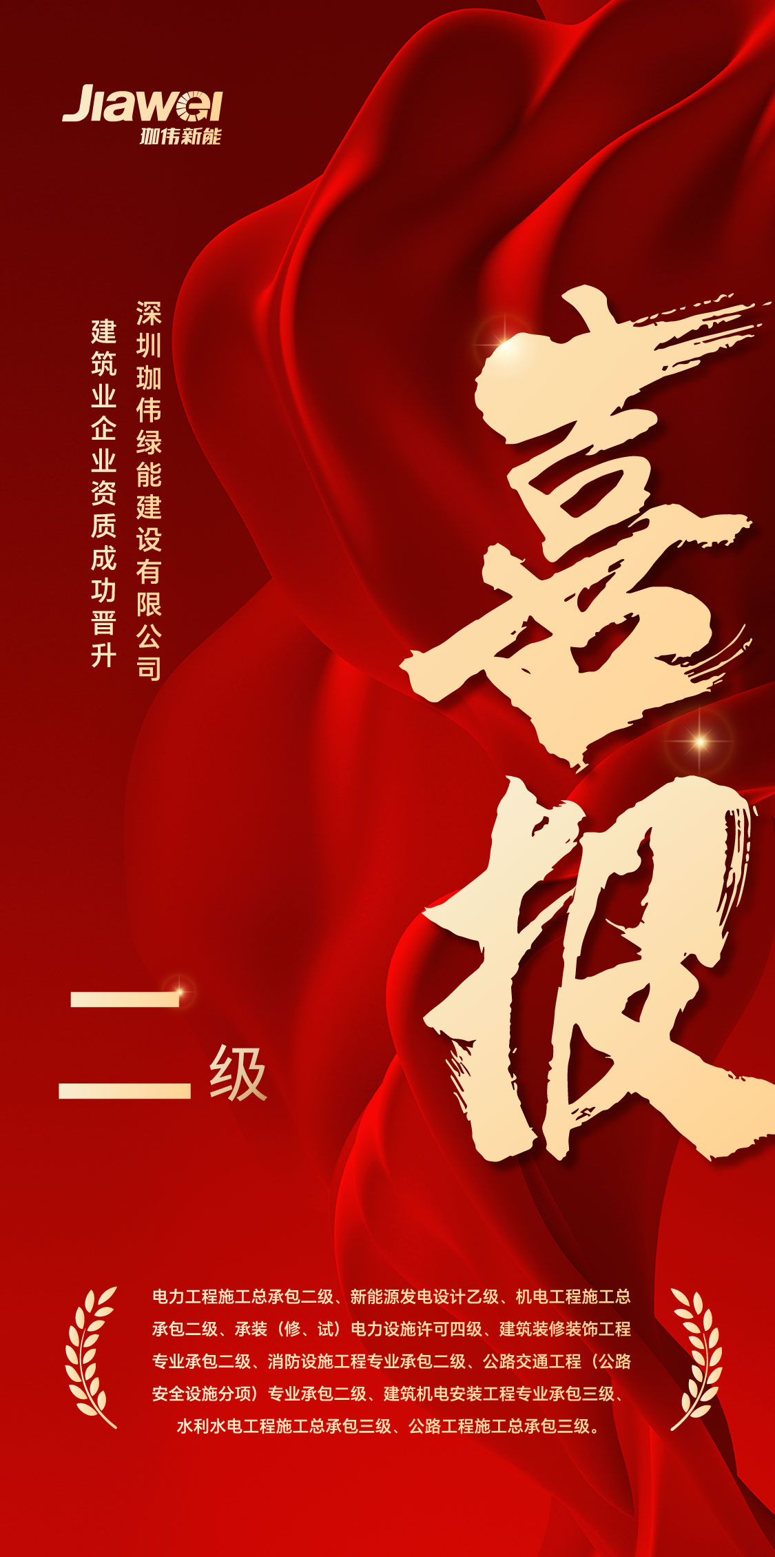 喜賀珈偉新能控股子公司深圳珈偉綠能建設有限公司近日完成了建筑業企業資質升級: