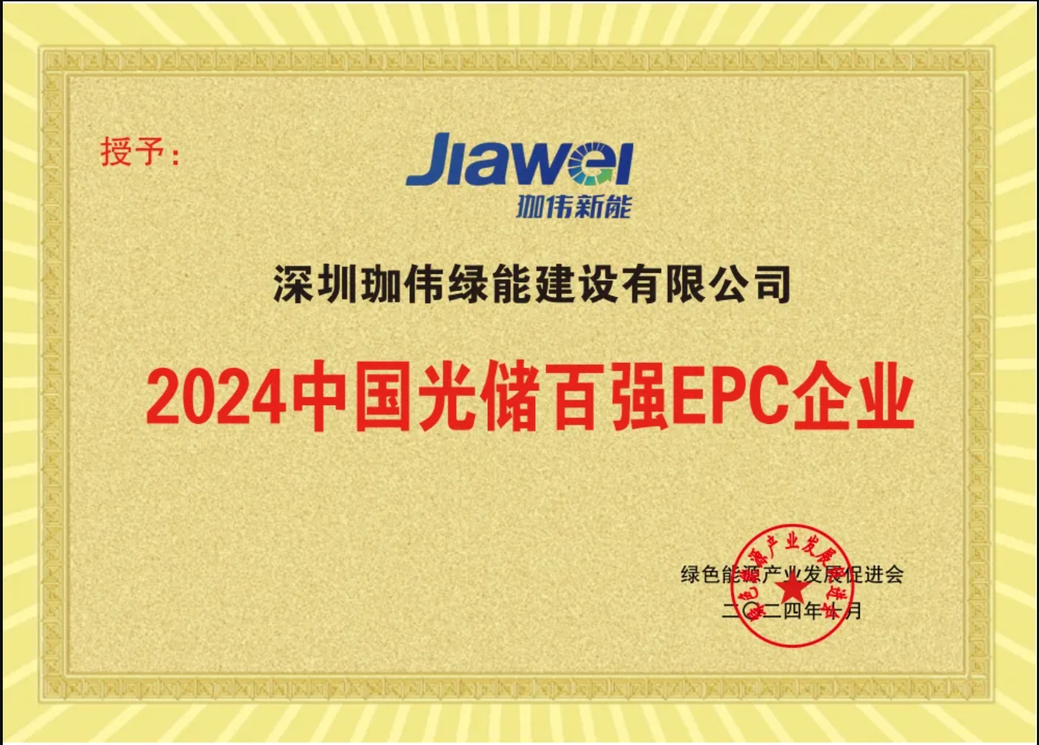 2024年10月23日,第十九屆亞洲光儲與合作論壇在杭州國際博覽中心舉辦。其中,由GEA綠色能源產業發展促進會舉辦的第十九屆亞洲光儲展同期“2024 中國光儲百強 EPC 企業獎”在杭州順利落幕,珈偉新能控股子公司深圳珈偉綠能建設有限公司榮獲“2024中國光儲百強EPC企業”稱號。